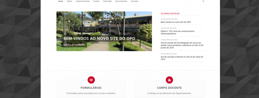 Foi lançado hoje, 04 de agosto, o novo site do Departamento de Odontopediatria e Ortodontia. O site visa atender as necessidades informacionais da comunidade acadêmica vinculada a este departamento, de forma mais rápida e simples. A página foi construída pelo Núcleo de Informática da Faculdade de Odontologia e esta dentro do plano de reestruturação do Portal da Faculdade.