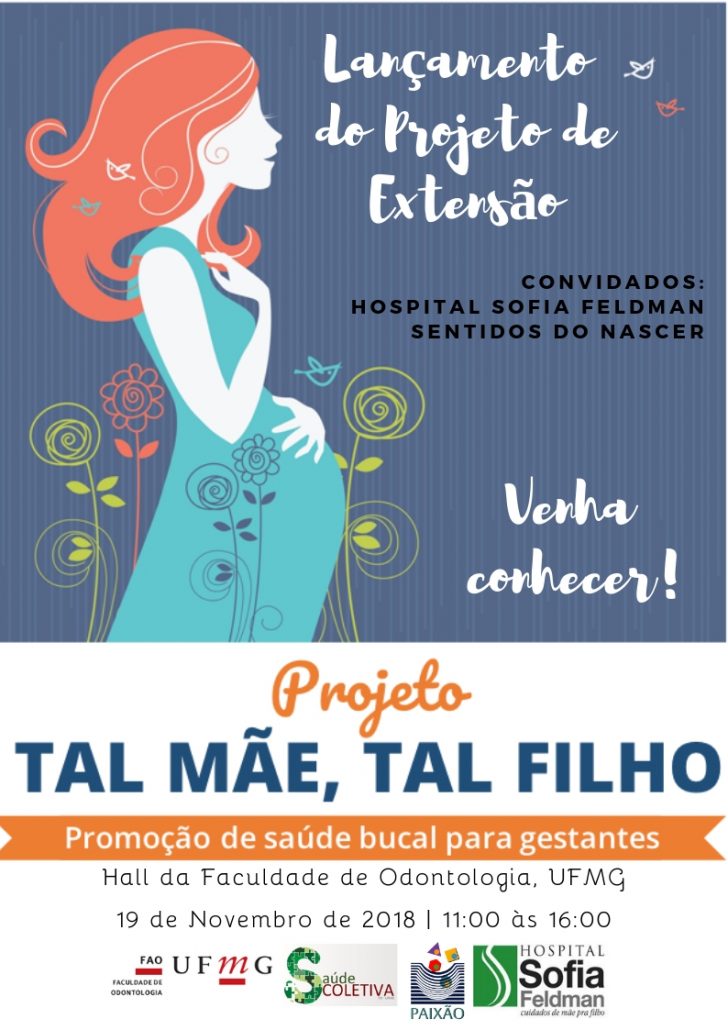 Na próxima segunda-feira, dia 19 de novembro, será feito o lançamento do Projeto de Extensão TAL MÃE, TAL FILHO – Promoção de Saúde Bucal para Gestantes, no hall da Faculdade de Odontologia da UFMG. O projeto, sob a coordenação das professoras Lívia Zina e Mara Vasconcelos, conta com a parceria do Hospital Sofia Feldman, e irá ofertar pré-natal odontológico a gestantes, tendo prioridade as gestantes da comunidade acadêmica da UFMG, e gestantes e lactantes do hospital. O início das atividades acontecerá em março de 2019, porém a seleção dos alunos irá ocorrer ainda este ano. O evento de lançamento contará com a participação da instituição parceira – Hospital Sofia Feldman – além de um convidado especial, o Projeto Sentidos do Nascer. TAL MÃE, TAL FILHO é um projeto de extensão lotado no Departamento de Odontologia Social e Preventiva.